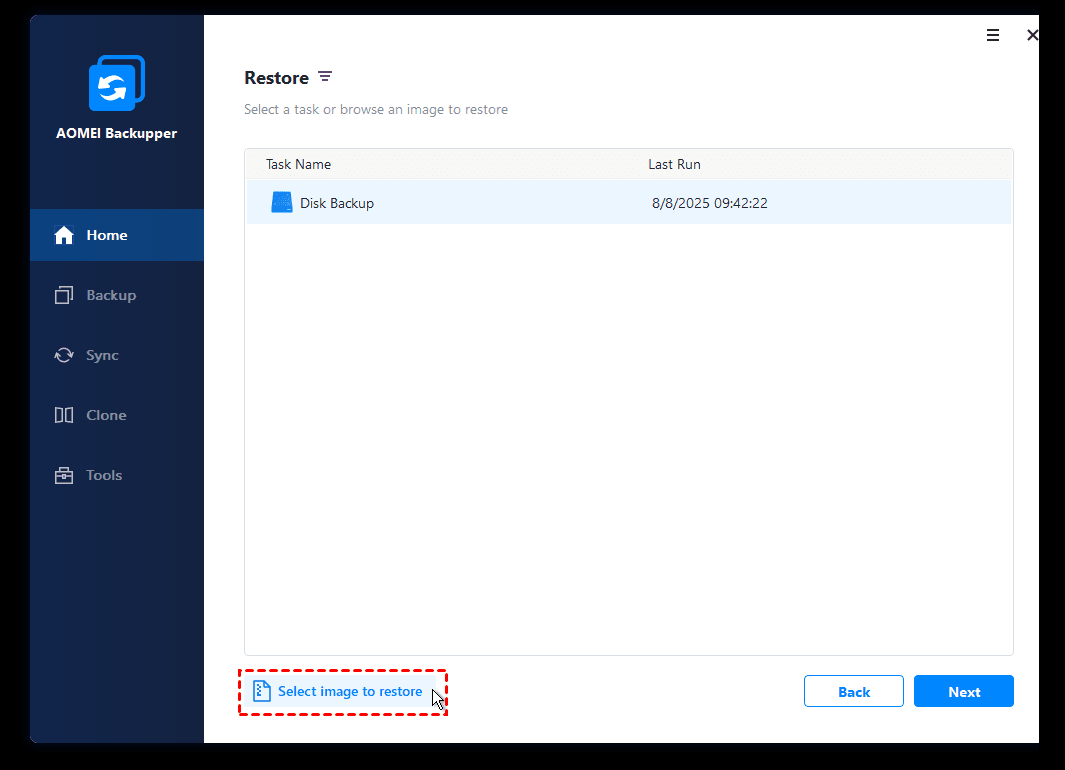 3. Once logged in, you’ll see a loaded AOMEI Backupper right now. Click Restore and then Select Image File to select the disk image.