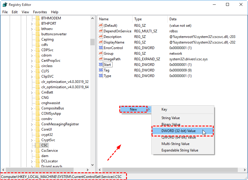 HKEY_LOCAL_MACHINE\SYSTEM\CurrentControlSet\Services\CSC
