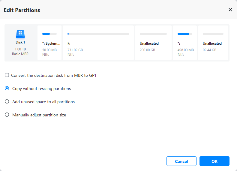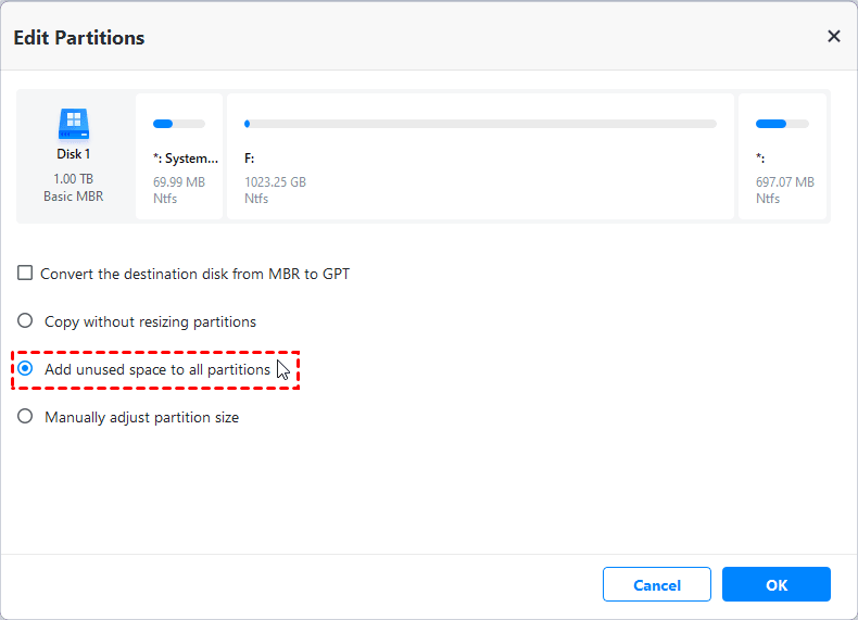 - Add unused space to all partitions: The destination disk partitions will be automatically resized to fit the entire disk, appropriate for the disk size.