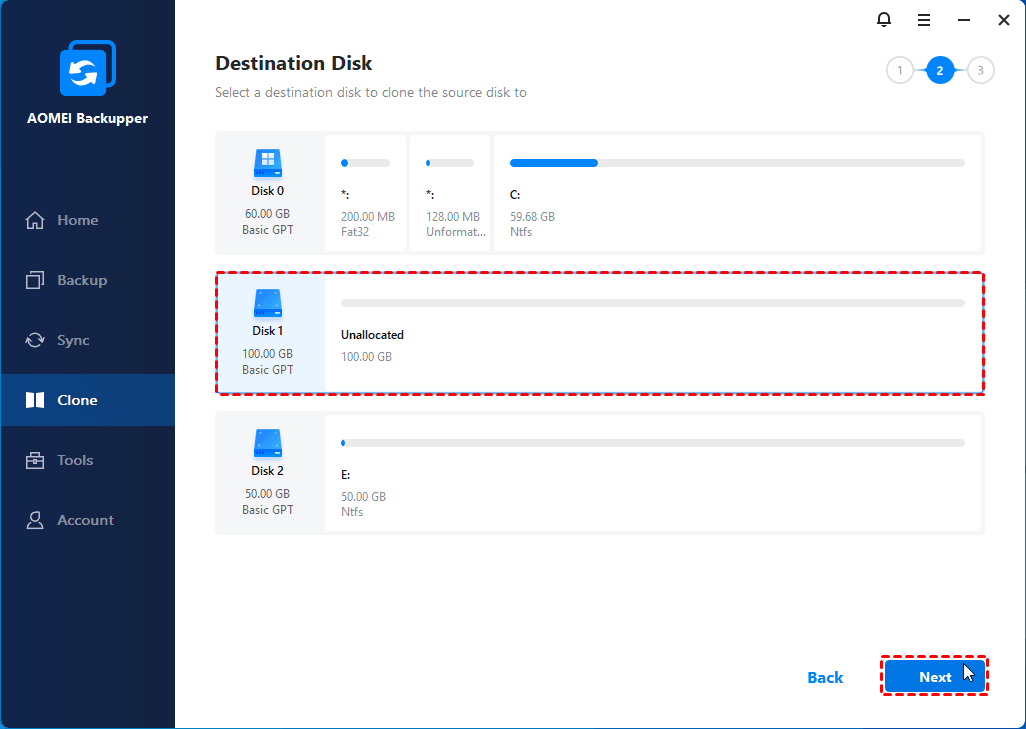 Select the destination disk to which the source disk will be cloned, and click "Next".