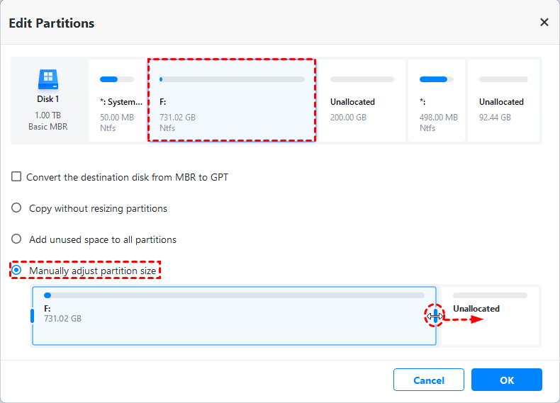 a) Edit Partitions: To adjust the size of the partitions on the destination disk if it's larger, you can select the feature and one of the following options.