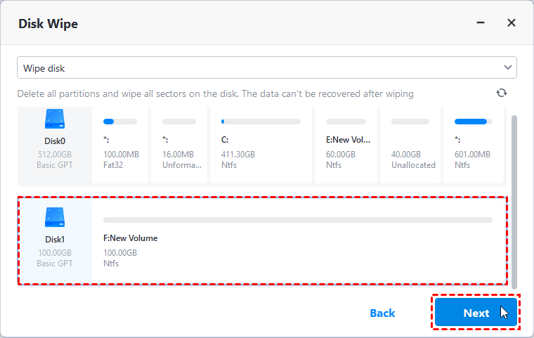 If you can select the "Wipe Partitions or unallocated space on the disk" option on the previous page, you can choose to wipe any partition or unallocated space of any disk on this page, and you can select multiple ones at the same time.