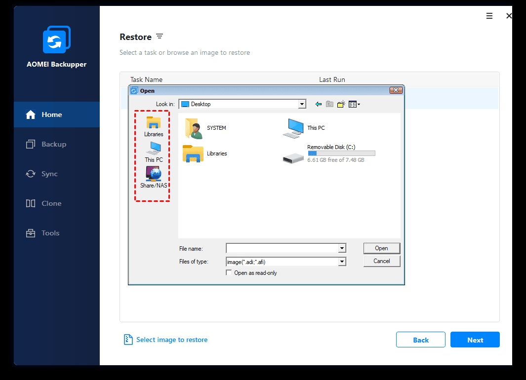 Step 2. Find a system image. After the destination computers boot into recovery environment (here is Windows PE), AOMEI Backupper will pop up automatically. Then, click "Home" tab and click on Restore -> "Select image to restore" to find the system image you created.