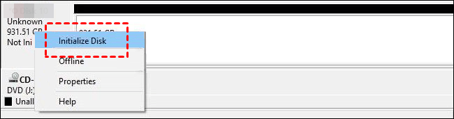 - Right-click on the disk that reads "Not Initialized" and select "Initialize Disk".