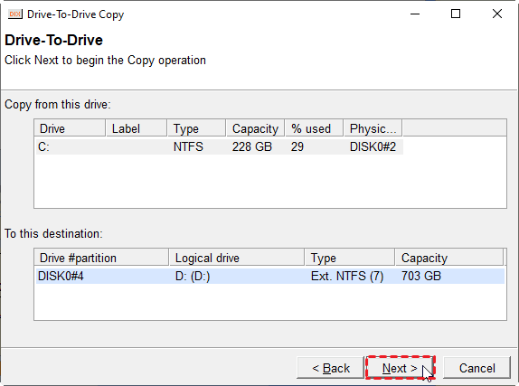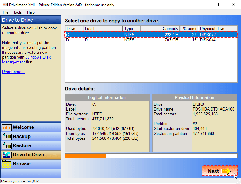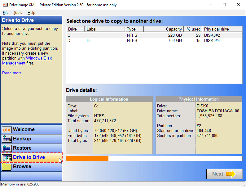 - Then DriveImage XML will show you again which drives you selected as the source drive and as the destination drive. Make sure you selected the correct drives and click Next to begin the operation.