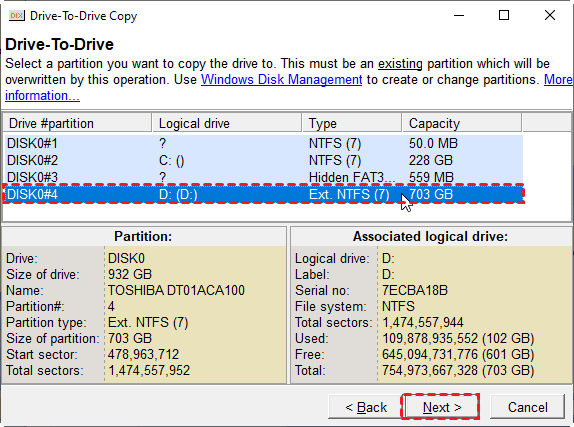 - Select the boot drive you wish to copy to another drive and click Next to continue.