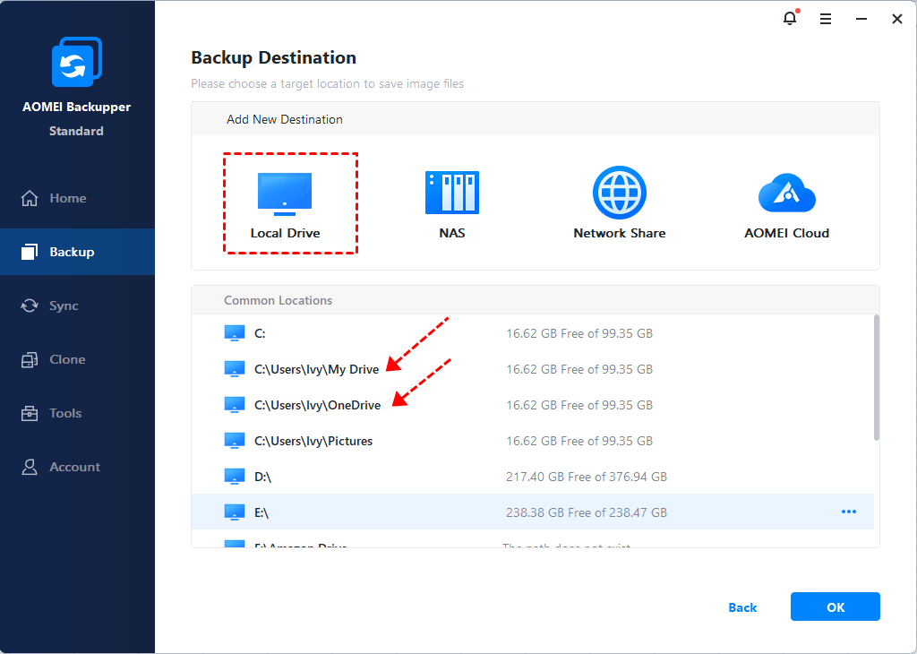 🔹You can use this tool to backup folders to popular cloud storage services such as Dropbox, OneDrive, Google Drive, and Box, and it allows you to backup files and folders to external hard drive, local disk, NAS, network drive, etc.