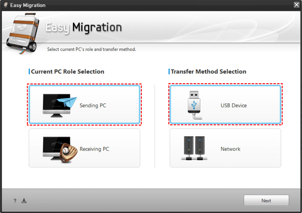 3. Select the current PC role as Sending PC and transfer method as USB Device, and then click Next.