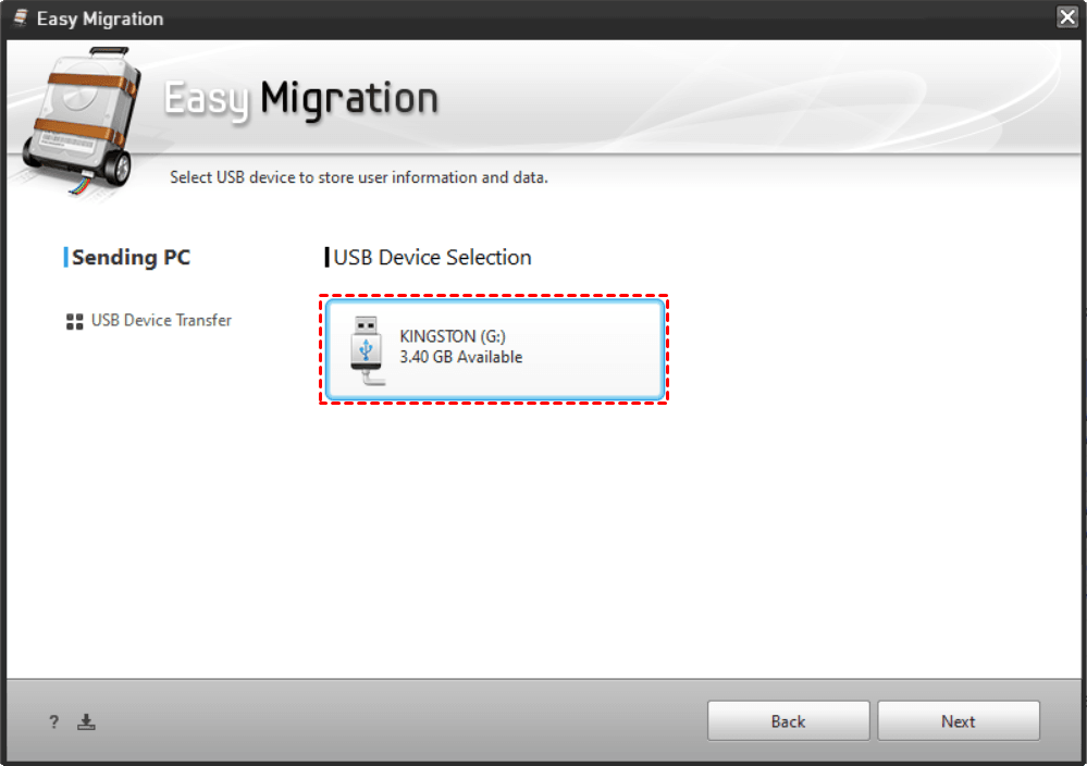 1. Connect the USB device that contains the user data you want to transfer to the target PC. Launch Easy Migration and click Next on the launch window.