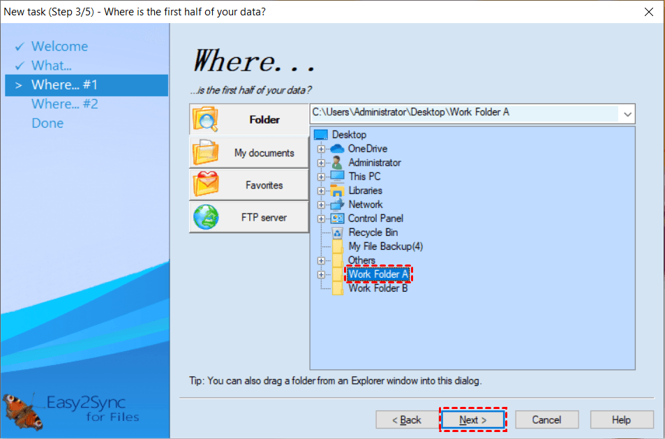 5. Choose the second half of your data and click Next. Here I choose a Local folder. If you want to sync files between computers, choose Other PC.