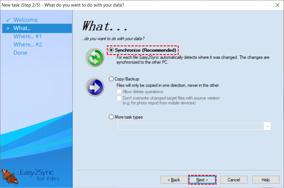 3. On the Welcome page of the new task wizard, click Next. Then choose Synchronize (Recommended) and click Next. This option will do two-way sync between the source and destination directory.