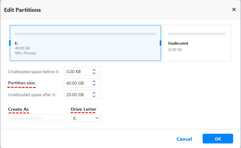 Manually adjust partition size: Manually adjust the partition size and location by dragging the slider bar.