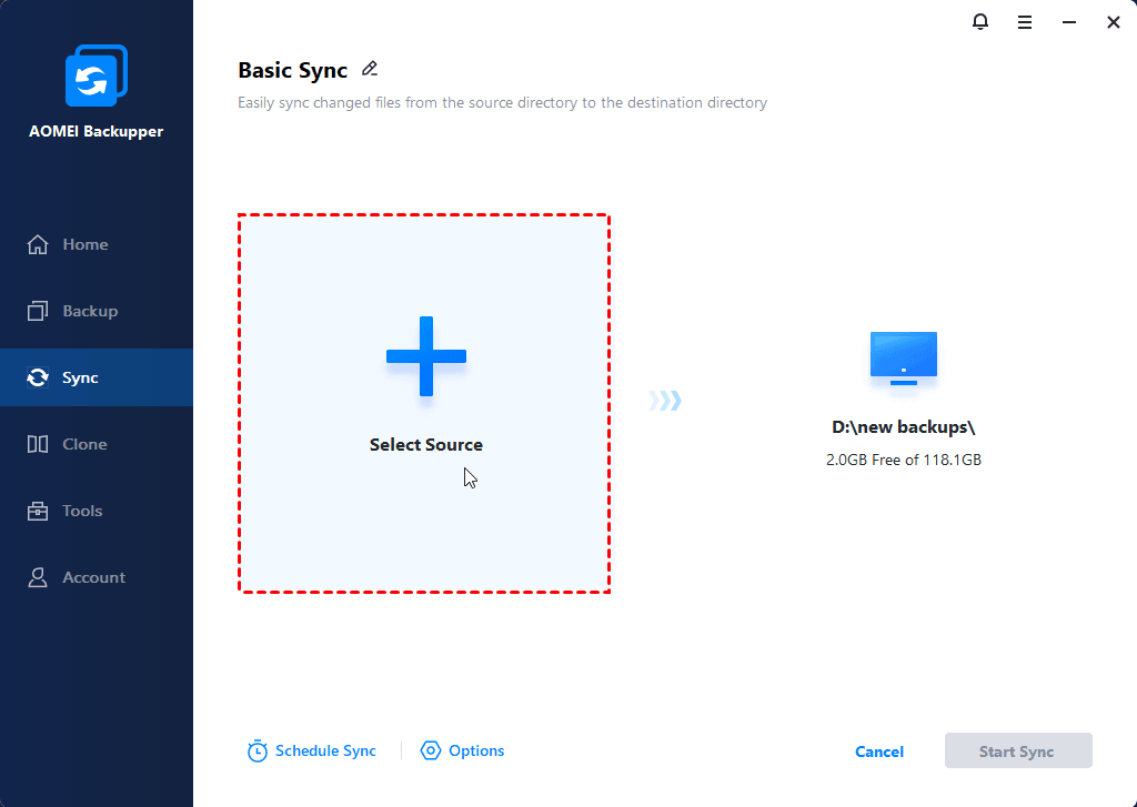 With the help of best file sync software - AOMEI Backupper Professional, you can easily perform file sync during system shutdown without losing data, and the sync destination can be any storage including cloud storage like OneDrive, Dropbox, Google Drive etc or external disk, network drive, etc.