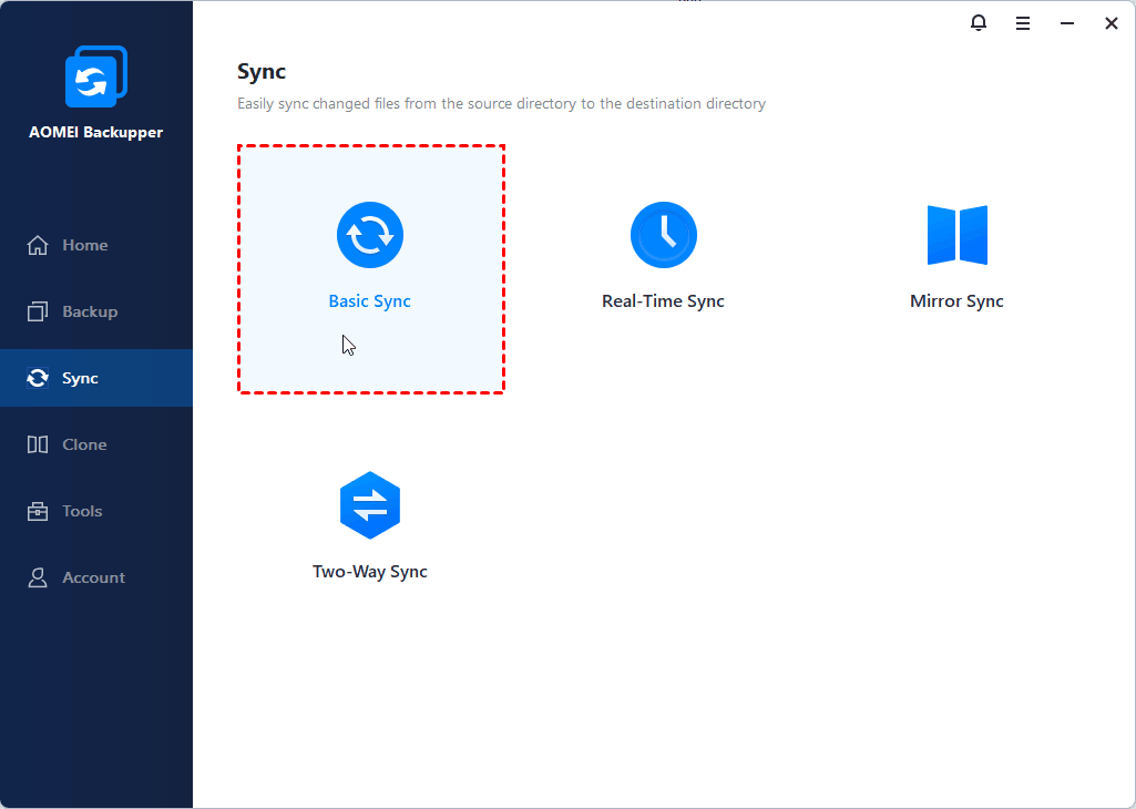Step 1. Launch AOMEI Backupper Standard, click Sync and Basic Sync in order.