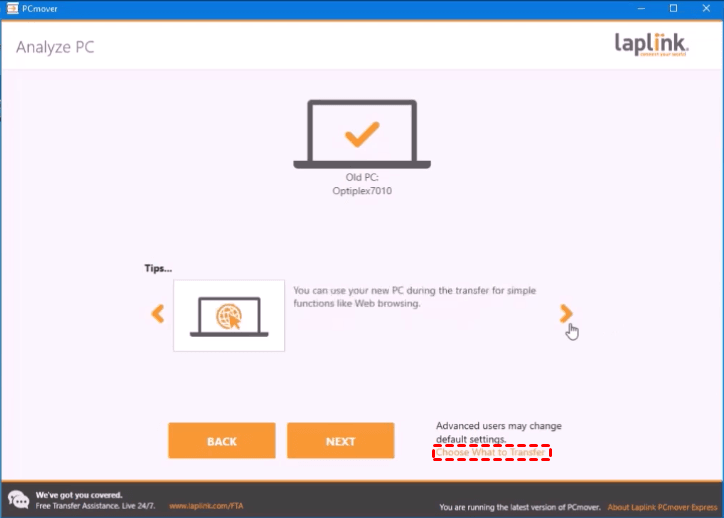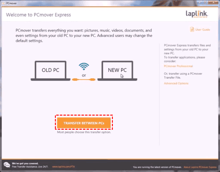 Run PCmover Express on the new computer and click TRANSFER BETWEEN PCs on the main window,