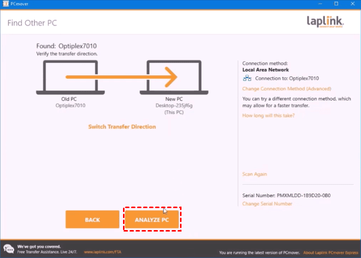 3. After the two PCs are connected, click ANALYZE PC on the new computer.