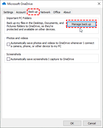 Please note that Important PC Folders in OneDrive can only backup files in Desktop, Documents, and Pictures folders to OneDrive.