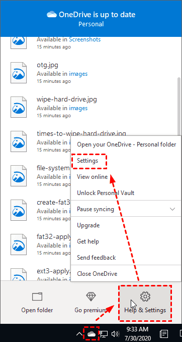 1. Click the OneDrive icon from the system tray, and choose Help & Settings > Settings.