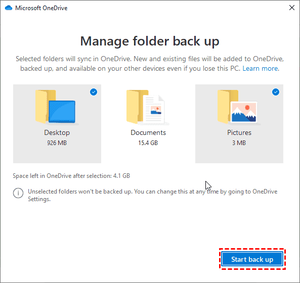 3. Choose the folder that you would like to backup, and click Start backup button to transfer files to OneDrive.