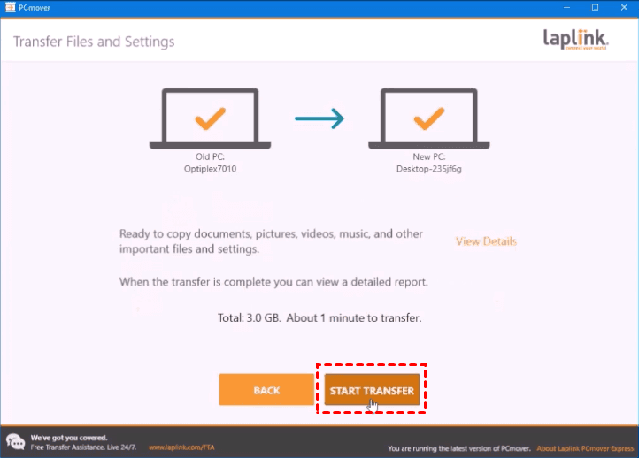 6. Press Start TRANSFER to transfer files from an old computer to a new computer.
