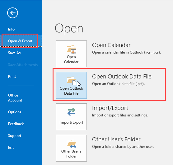 Step 2. Click on the File menu, choose Open & Export, and then click on Open Outlook Data File.