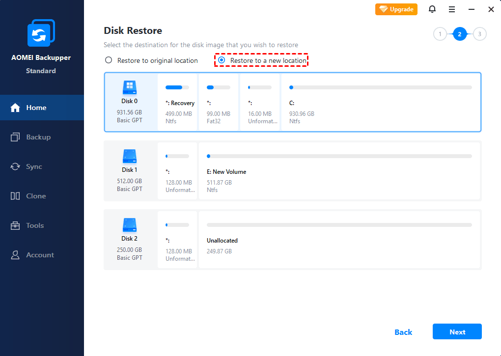 Step 3. Tick "Restore to a new location". Select the new disk as the restoration destination and click "Next".