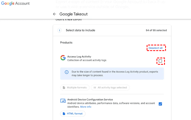 4. This will take you to the Google Takeout page, click the Deselect all button. Note that Access log activity can slow down your download considerably, so you may want to leave it unchecked.