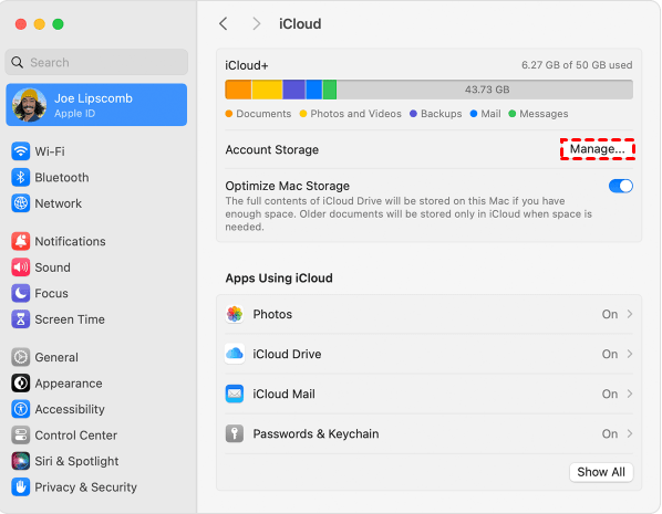 2. Check if you have enough iCloud storage. If your storage is full, click Manage > Change Storage Plan or Add Storage to buy more storage.