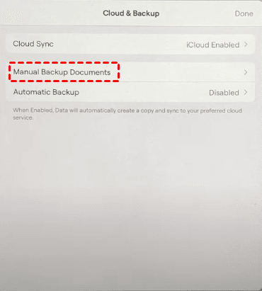 - Click Manual Backup Documents > Done to backup your latest notes.