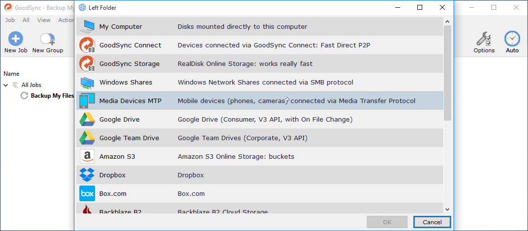 1. Click + New Job button, enter a job name (Backup My Files), and tap a job type: Backup or Synchronize (here is Backup), press OK.
