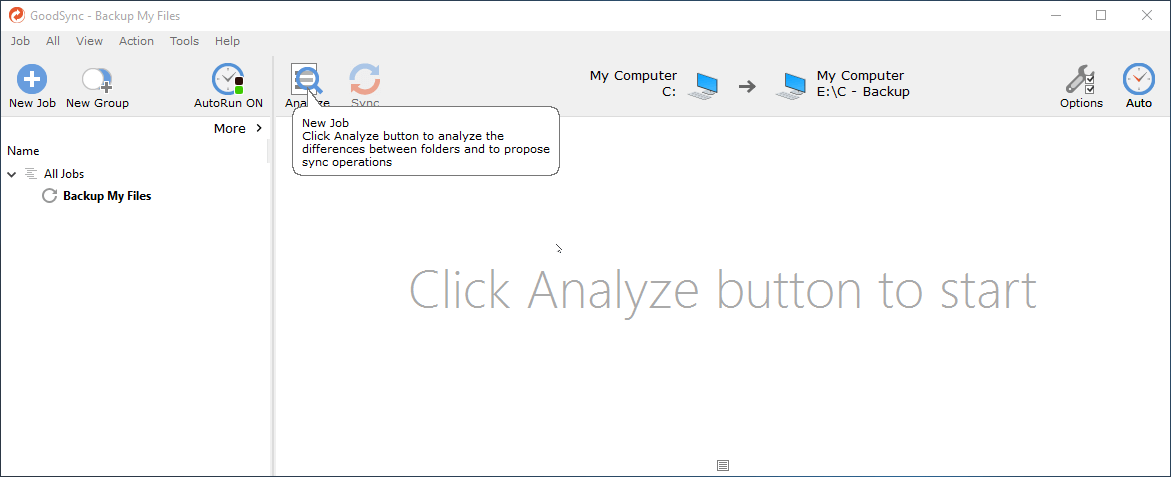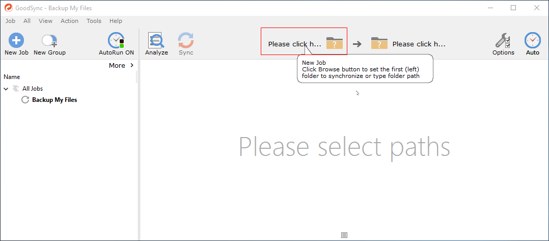 Note it requires you to create a GoodSync account. If you have never used GoodSync, it will notice you to create a new GoodSync Job, then follow the steps to create a file backup.
