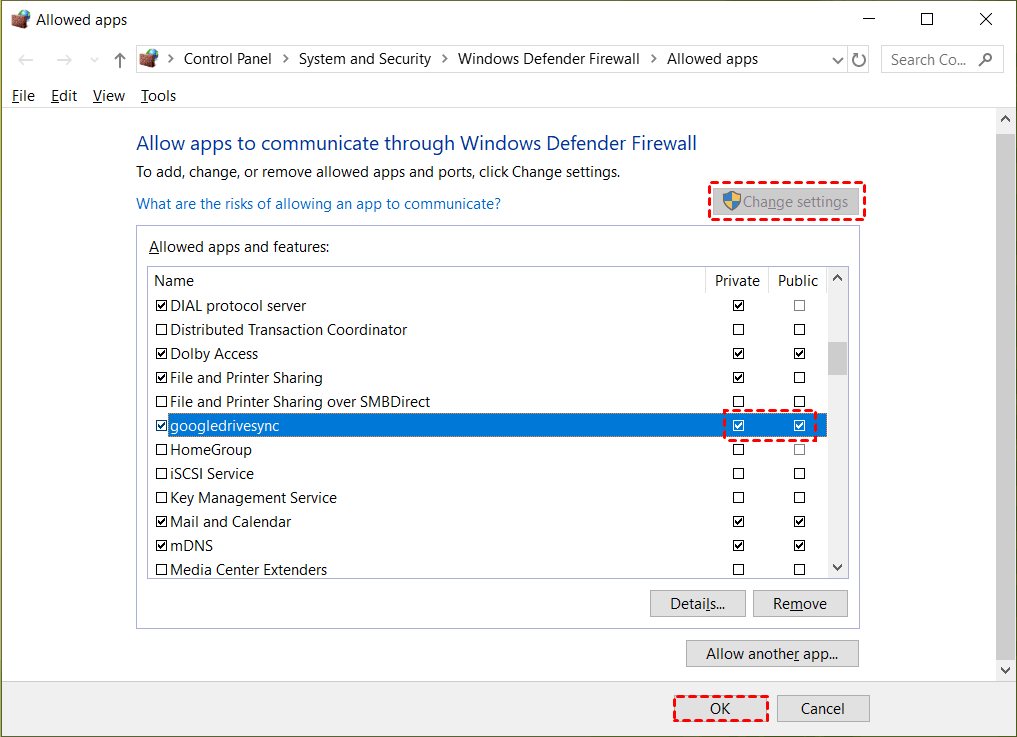 3. Click Change settings. Then, find “googledrivesync” and enable it under both Private and Public column. Click OK to exit.