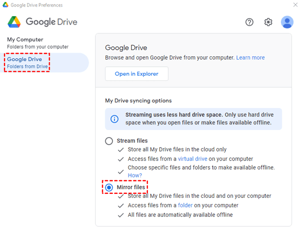 Mirror files: Stores all My Drive files both in the cloud and on your local computer, accessible from a Google Drive folder on your computer.