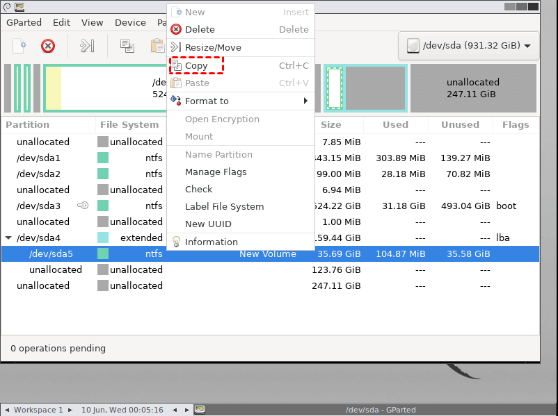 Step 4. Upon completion, the GParted interface will open. Right-click on the desired partition to be copied and select the "Copy" option from the dropdown menu.