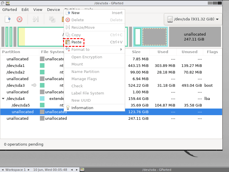 Step 6. A new window will emerge upon clicking the "Paste" button, allowing you to specify the allocation of unallocated space. Resize the partition if necessary to accommodate. Upon configuring the settings, click on the "Paste" button followed by "Apply" to commence the copying partition with GParted process to either an SSD or HDD.