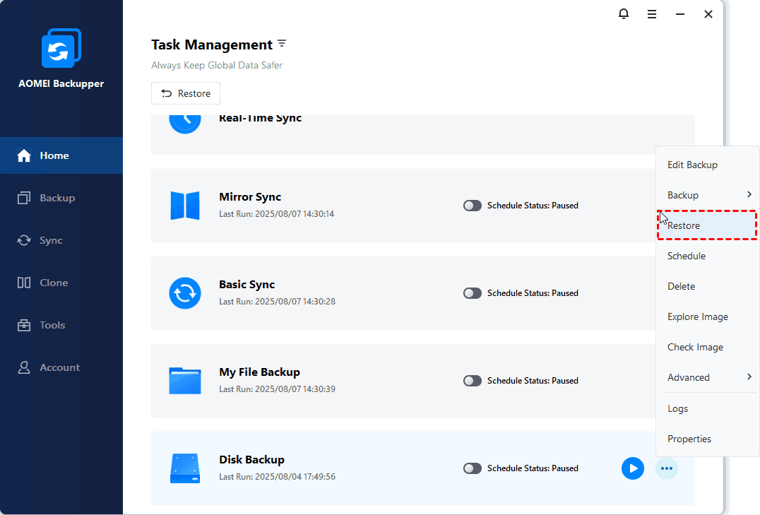 >>> Method 1: In the "Home" tab, click "Restore" option of a corresponding backup task.