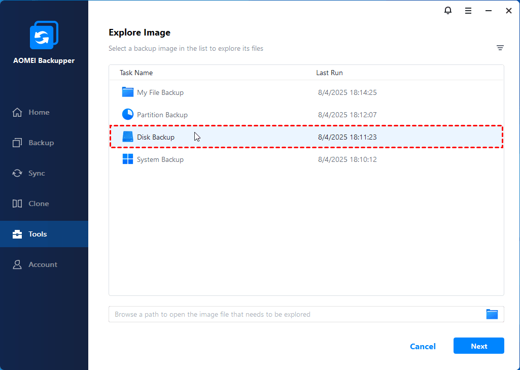And then, select a backup task, and click "Next". (You can also browse a path to open the image file that needs to be explored.)