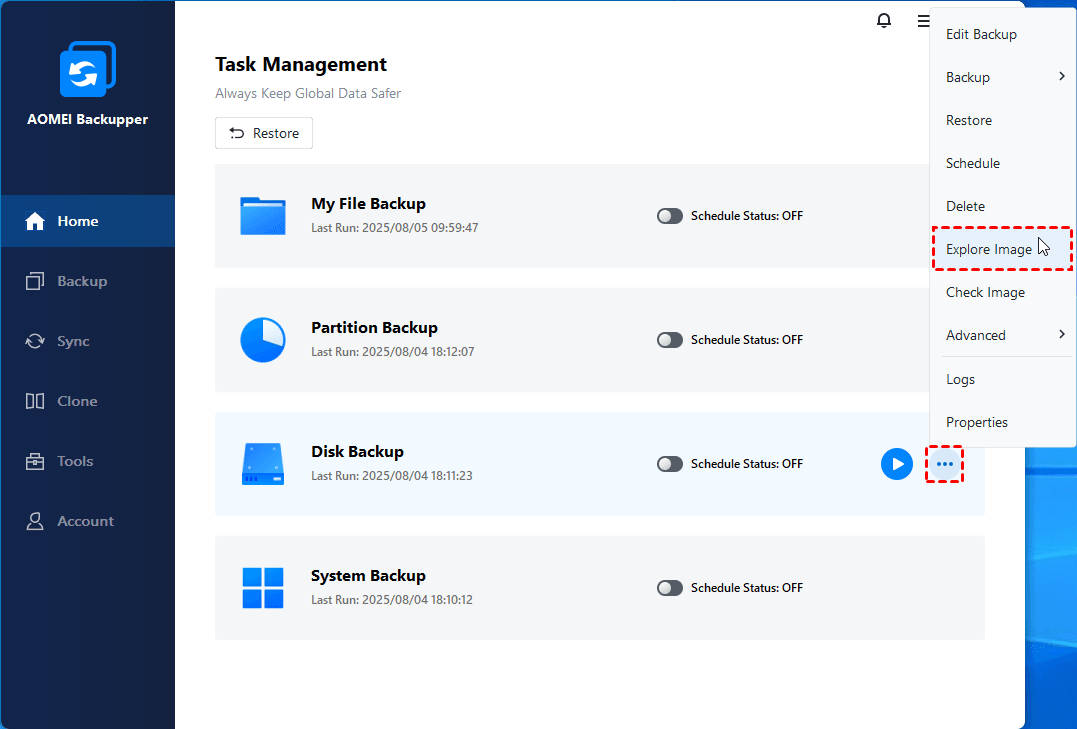>>> Method 1: click "Home" tab, and then select a backup task that you want to restore. Click the three horizontal lines button > "Advanced" > "Explore Image" option under the "Advanced" item.