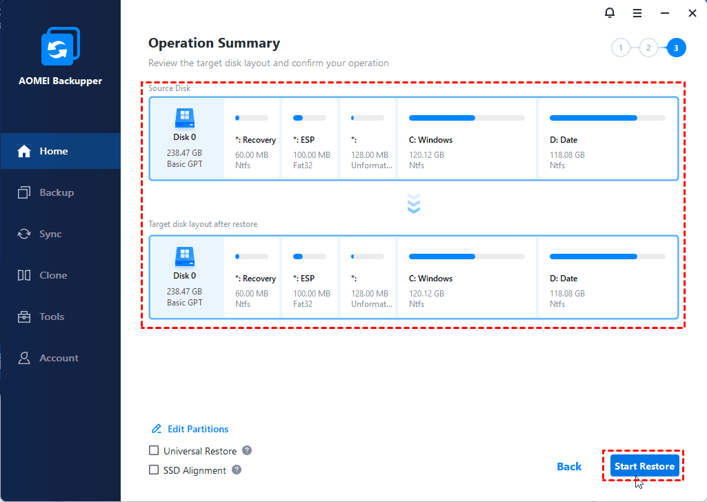 Step 3. The source disk and the destination disks will be listed in this step. Confirm the operations and click "Start Restore".