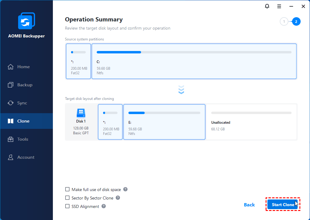 Sector by sector clone: It is able to copy all sectors of the system partition including empty or bad sectors. The destination disk size must be equal to or larger than the source disk.