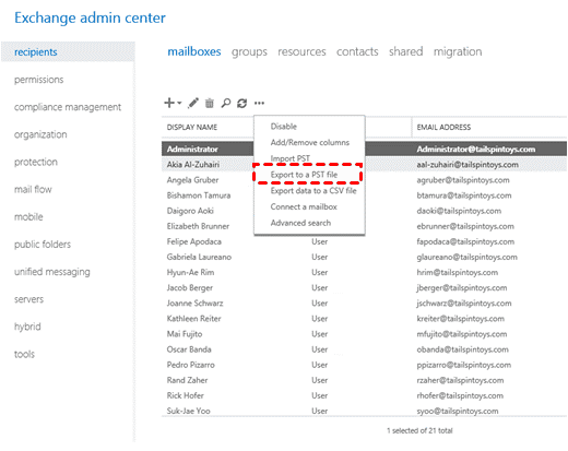 1: Follow the instruction: EAC >> Recipients >> Mailboxes >> More options and select Export to a PST file.
