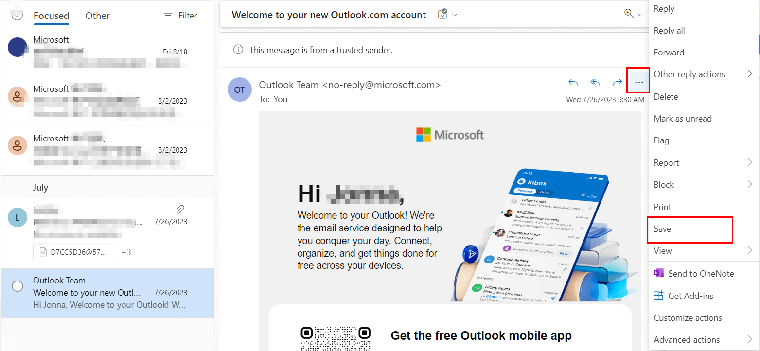 Step 3. In the top-right corner of the email section, click on the three dots. From the drop-down, click on Save. Then, it will be saved as an EML file in your Downloads folder.