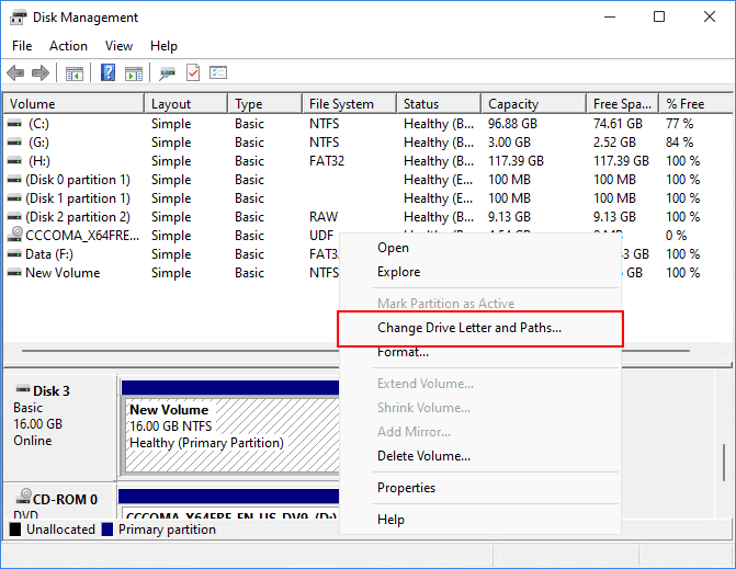 4. If the drive shows as "New Volume". Right-click and select "Change Drive Letter and Paths." Assign a new drive letter to make it accessible.
