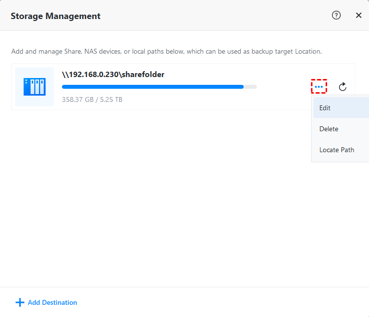 Through the tool "Storage Management", you can add NAS to the storage list in advance. You can view, edit, or manage the NAS, and you can also directly select the NAS as the destination path when creating a task.
