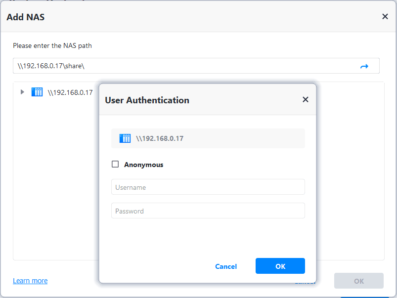 And, it is recommended to add the NAS with the format of IP address, for example, \\192.168.4.230\, not with the format of domain name.