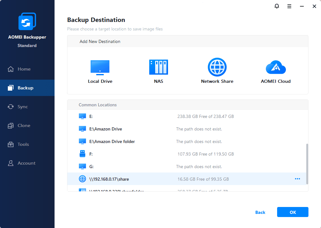 A: If you select the mapped network drive as the destination, please try to add the network path to AOMEI Backupper, and then recreate the backup/sync task and select the added network path as the destination.