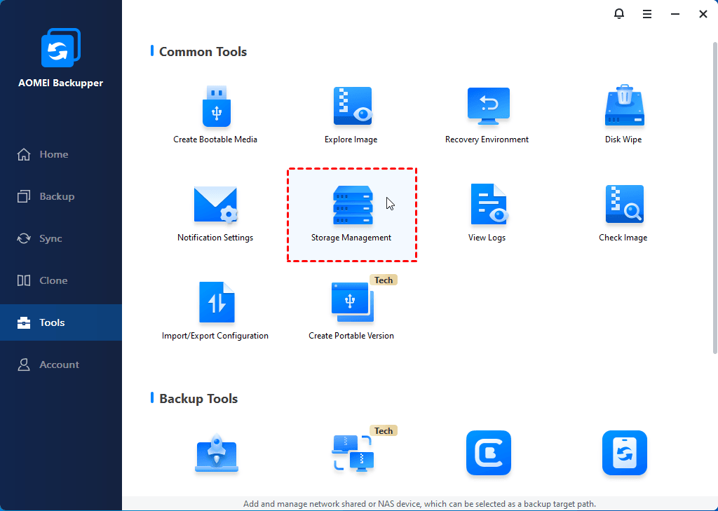 Then, before you start any operation, download AOMEI Backupper Standard and install it on your computer. Then, learn the "Storage management" tool and backup files later.