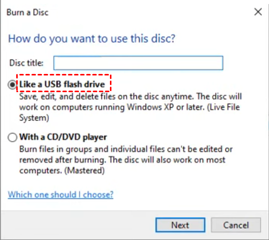 Step 3. Then, you will be navigated to Burn a disc window. Input a disc title and select the way to burn files - "Like a USB flash drive" or "With a CD/DVD player", click Next. It will start to format CD/DVD for storage.