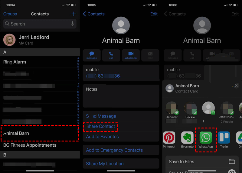 Step 2. Select Share Contact > Choose WhatsApp from the provided list of options. The contact is now successfully accessible on WhatsApp.