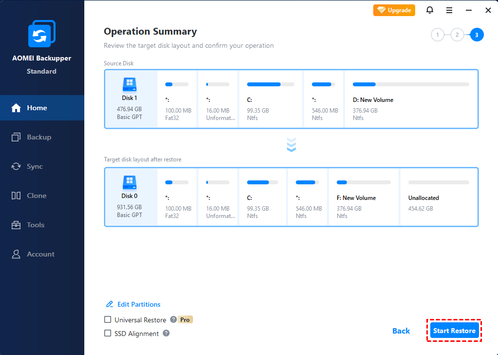 Select connected SSD as the destination disk. Confirm the operations and click "Start Restore".